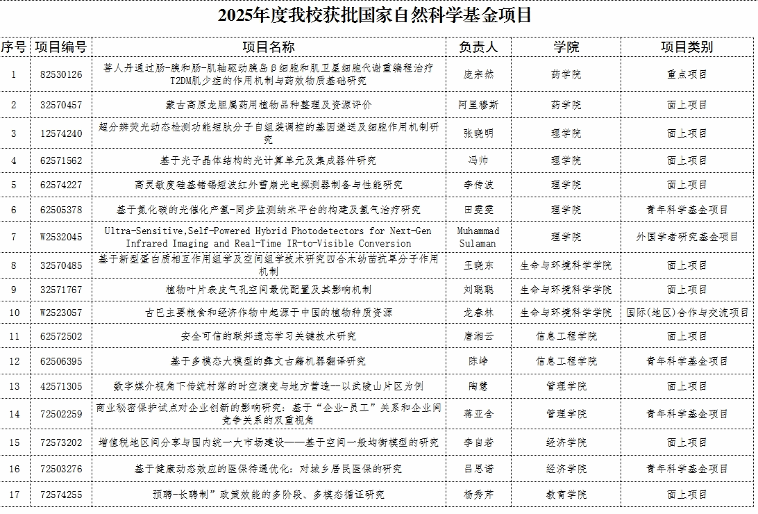 新闻网讯  近日,国家自然科学基金委员会公布了本年度申请项目评审结果。学校共获批国家自然科学基金项目17项,与2024年相比,立项数增长了21.4%,体现出学校科研管理体制的持续优化和教师科研能力的不断提升。