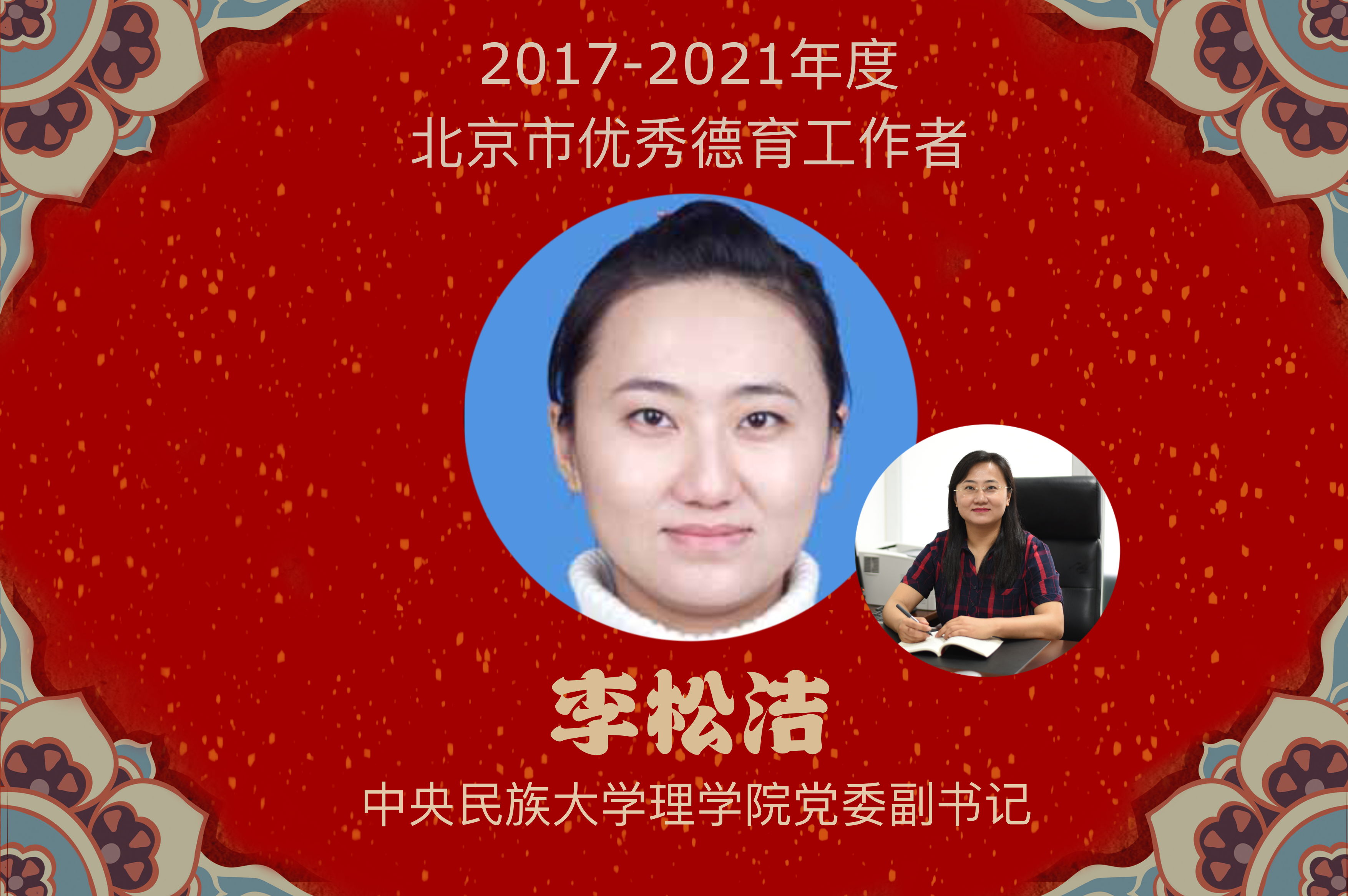 李松洁,理学院党委副书记,理学院纪委书记。2008年留校担任理学院一线专职辅导员,13年专职辅导员经历,培养了2500余名毕业生,构建了润物无声的多种育人工作体系。坚持以谈心谈话为主线了解学生,以特色活动为途径引导学生,以实践活动为依托锻炼学生,以细心关爱为纽带感动学生。以立德树人为前提,以铸牢中华民族共同体意识为重点,注重增强各民族学生之间的互相理解与包容,促进党团组织建设,以自身的不懈努力为大学生思想政治教育工作者树立了典范。其洁若何,松生空谷。桃李不言,下自成蹊。时时刻刻牢记自己的使命,如空谷苍松般正直的节操为同学们树立起一支学习的标杆,在美美与共的精神指引下培育着各民族的桃李芬芳!